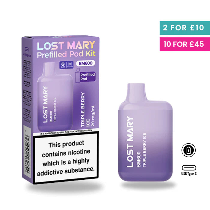 Experience the refreshing burst of Triple Berry with the Lost Mary BM600 Pre-Filled Pod Kit. This convenient, ready-to-use vape delivers an invigorating blend of sweet blue raspberry with a cool menthol finish.
